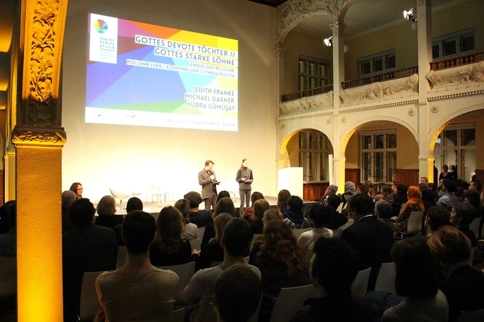 Unter dem Titel „Gottes devote Töchter//Gottes starke Söhne – Gender und Religion: Rollenbilder – Körperbilder – Symbolpolitik” diskutierten am 27. Februar Kübra Gümüsay, Prof. Dr. Edith Franke und Prof. Dr. Michael Daxner gemeinsam mit Teilnehmer_innen der Dialogperspektiven und dem interessierten Publikum über das Verhältnis von Religion, Geschlecht und Gender. Das Thema des Abends war im Laufe der Seminare sowohl des ersten als auch des zweiten Programmjahres immer wieder Gegenstand von Debatten und Diskussionen und wurde u.a. während des Frühjahrsseminar 2016 in der Arbeitsgruppe Menschenbilder Gesellschaftsbilder – Geschlechterbilder als auch im Frühjahrsseminar 2017 im Impulsvortrag Islamische Feminismen explizit thematisiert.