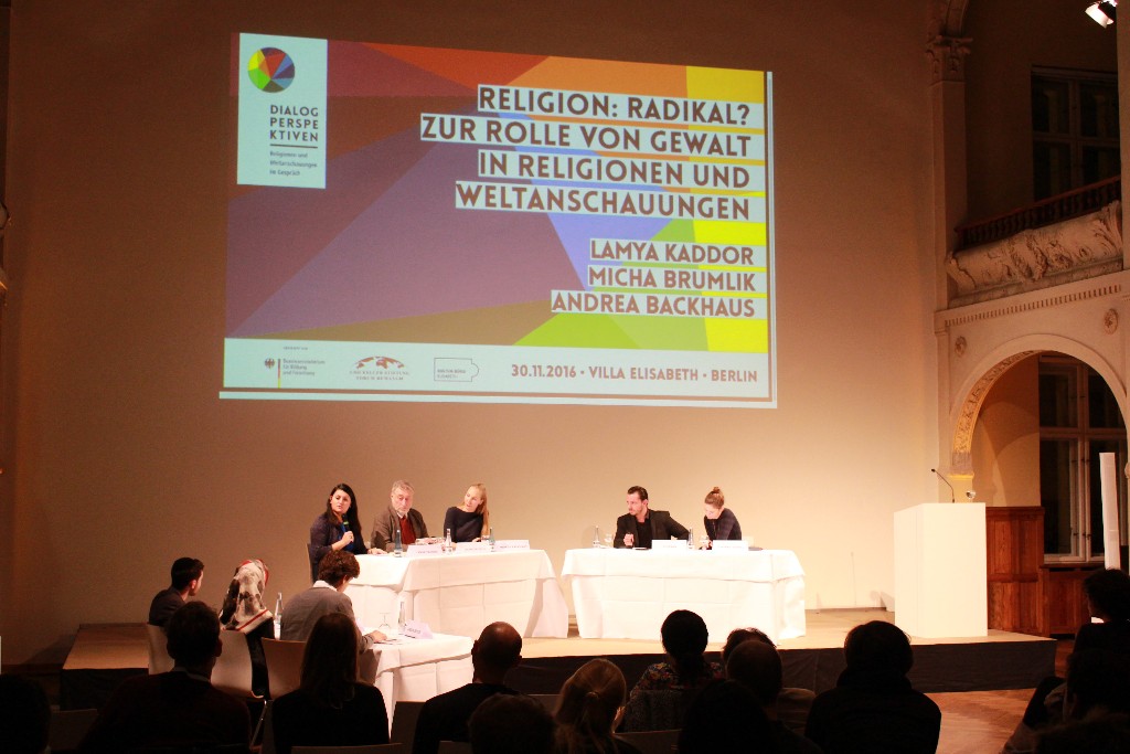 Am Abend des 30.11.2016 fand in Berlin die zweite Abendveranstaltung der Dialogperspektiven statt. Unter dem Titel „Religion: radikal?“ diskutierten Lamya Kaddor, Andrea Backhaus und Prof. Dr. Micha Brumlik in der Villa Elisabeth in Berlin mit Teilnehmer_innen der Dialogperspektiven über die Rolle von Gewalt in Religionen und Weltanschauungen.